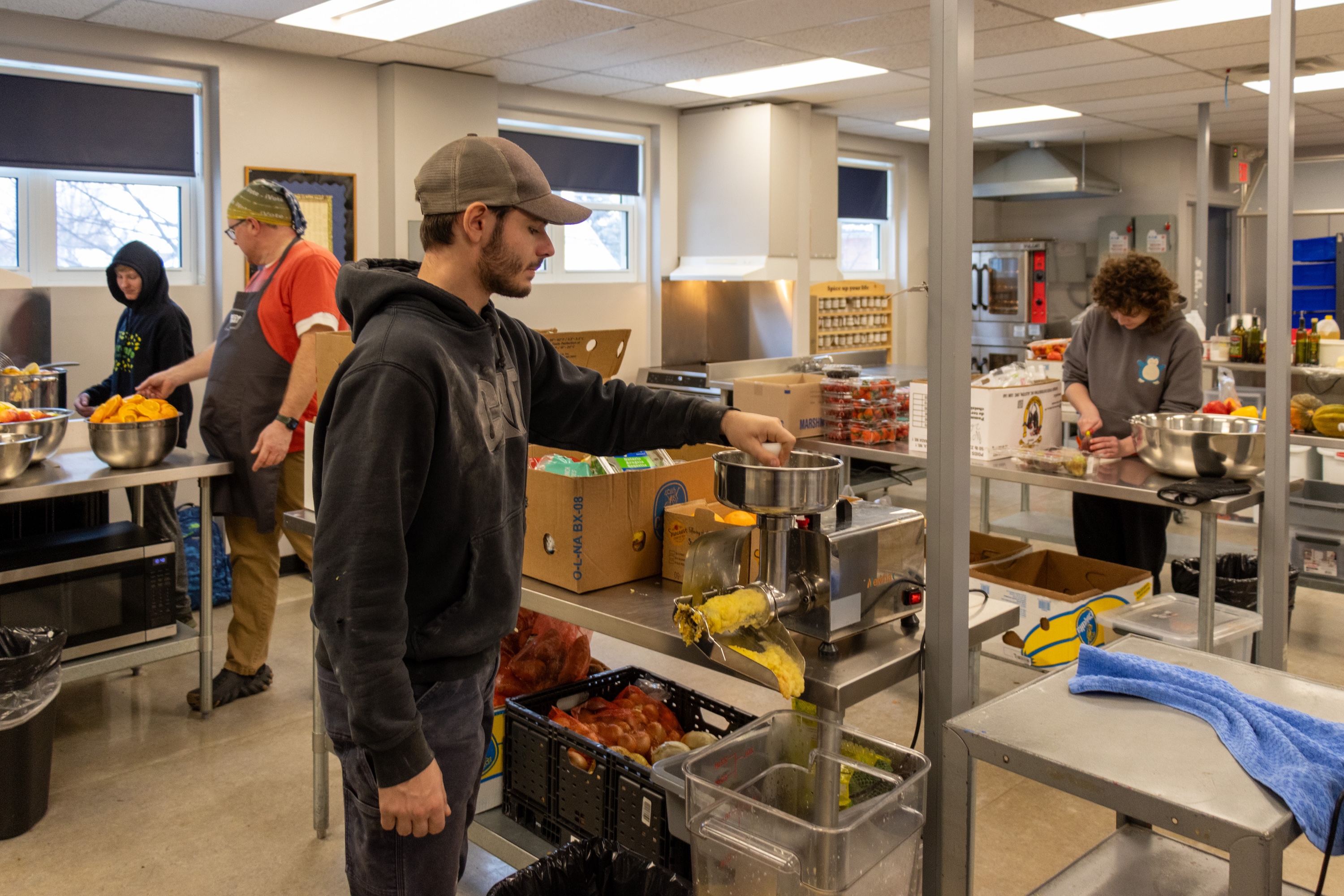 A typical day now includes large-scale food preparation made possible by new specialized equipment, such as professional sauce makers, dehydrators, and freeze-dryers. Students work at six cooking stations to turn fresh produce into hearty meals like shepherd's pie and soup within hours of its arrival from the grocery store. What might have ended up in a landfill becomes lunch for a neighbour.